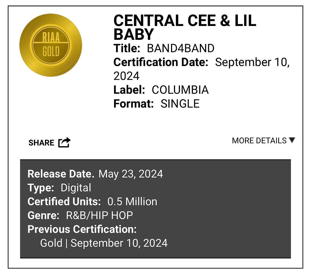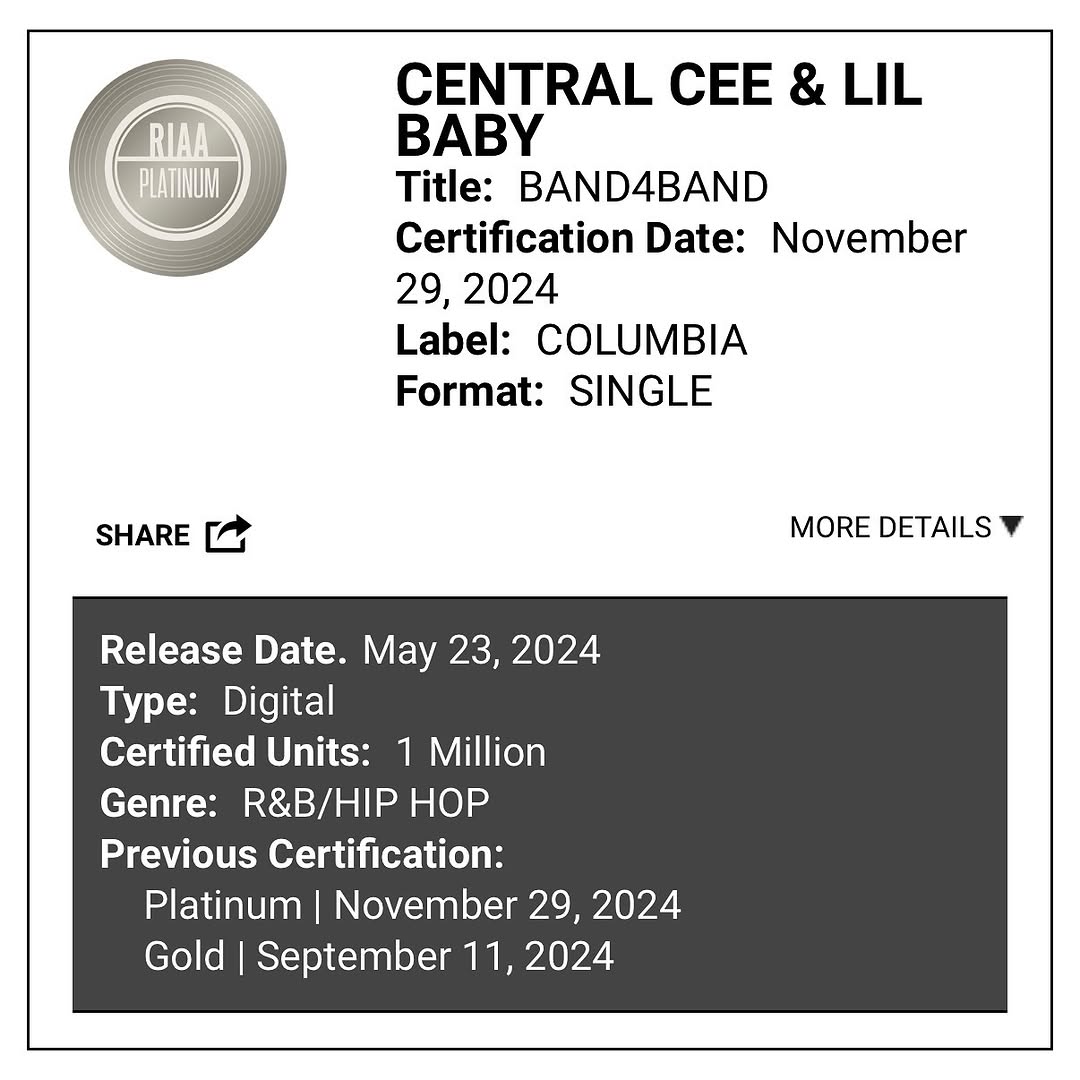 His global breakthrough came in 2024 with “Band4Band” by Central Cee featuring Lil Baby, which reached number 18 on the Billboard Hot 100, number three on the UK Singles Chart, and charted in over 30 countries. The track earned platinum certifications in the United States, United Kingdom, and Canada, and received an ASCAP Award. The parent album Can't Rush Greatness debuted at number one in six countries and reached number nine on the Billboard 200.